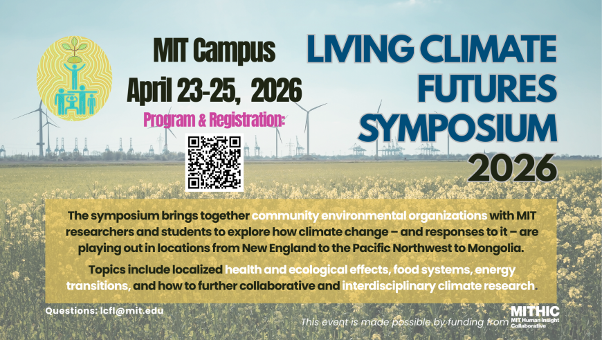 Living Climate Futures is an interdisciplinary initiative bringing together twenty MIT faculty and affiliates from across the Institute. LCF was the recipient of the inaugural Faculty Driven Initiative (FDI) Seed Grant from the MIT Human Insight Collaborative (MITHIC) in spring 2025. The symposium brings together community environmental organizations with MIT researchers and students to explore how climate change - and responses to it - are playing out in locations from New England to the Pacific Northwest to Mongolia. Topics include localized health and ecological effects, food systems, energy transitions, and how to further collaborative and interdisciplinary climate research.